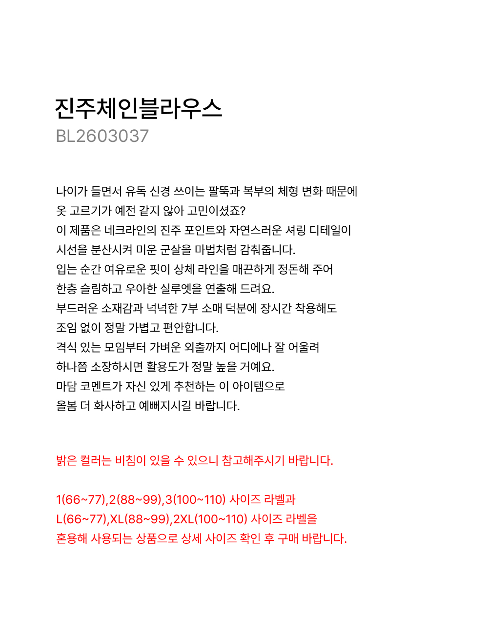 - ¹àÀº Ä÷¯´Â ºñħÀÌ ÀÖÀ» ¼ö ÀÖÀ¸´Ï Âü°íÇØÁֽñ⠹ٶø´Ï´Ù. 1(66~77),2(88~99),3(100~110) »çÀÌÁî ¶óº§°ú L(66~77),XL(88~99),2XL(100~110) »çÀÌÁî ¶óº§À» È¥¿ëÇØ »ç¿ëµÇ´Â »óǰÀ¸·Î »ó¼¼ »çÀÌÁî È®ÀÎ ÈÄ ±¸¸Å ¹Ù¶ø´Ï´Ù.
